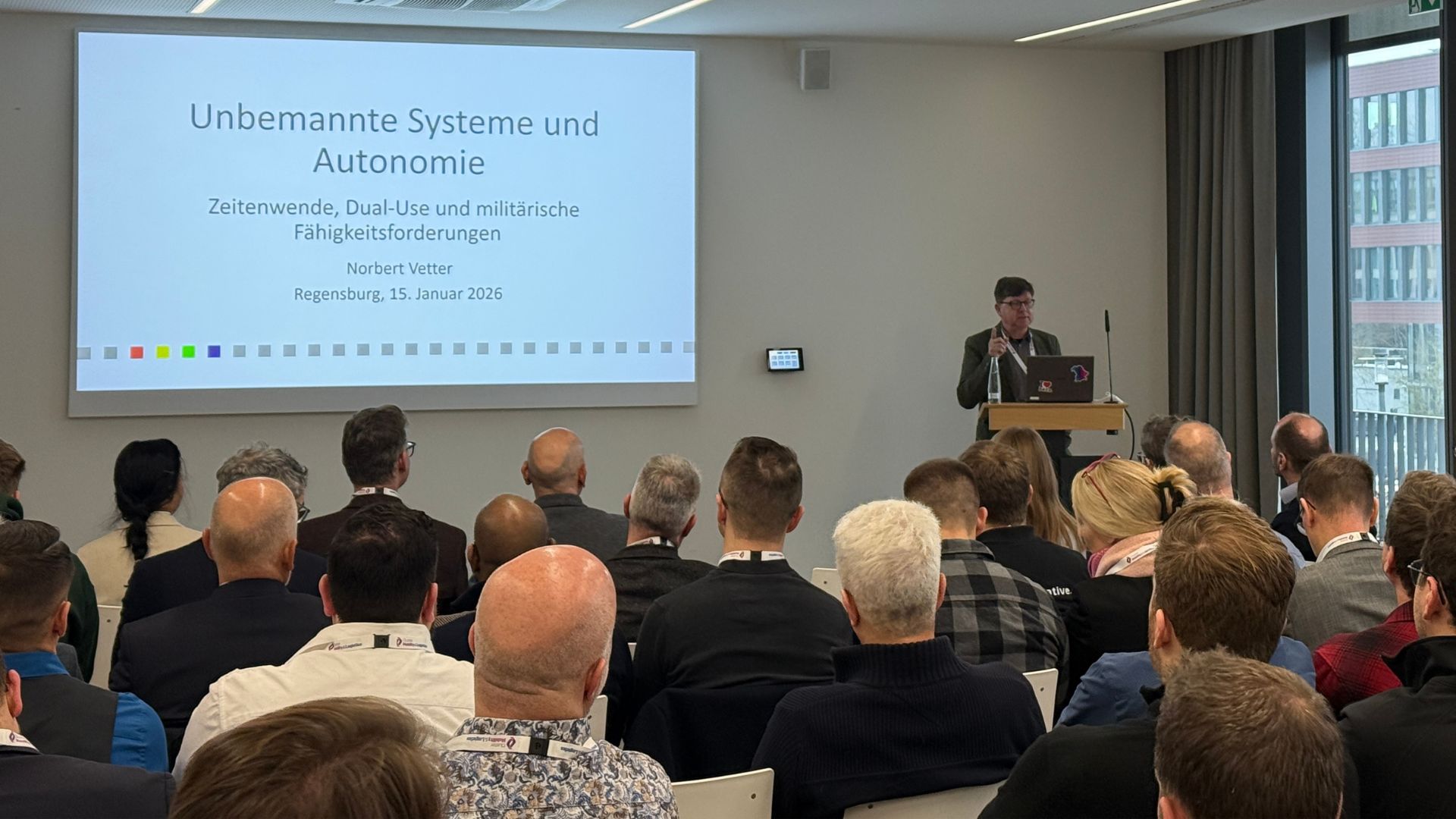 Nach einem kurzen Empfang und der Begrüßung durch Uwe Pfeil (Clustermanager TechBase Regensburg GmbH) wurde der Workshop mit einem Impulsvortrag von Oberst d.R. Norbert Vetter (Digitalisierungsunterstützung CyberReserve, Zentrum Digitalisierung und Fähigkeitsentwicklung Cyber und Informationsraum, Bundeswehr) eröffnet. Er thematisierte die Zeitenwende in der Sicherheits- und Verteidigungspolitik, die Relevanz der Autonomie unbemannter Systeme sowie die Anforderungen an DualUseTechnologien im militärischen Kontext. Dabei skizzierte er zentrale Fähigkeitsforderungen der Bundeswehr und wies auf die Bedeutung abgestimmter technologischer Entwicklungen hin.