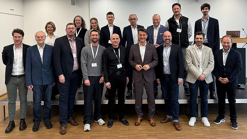 Gruppenfoto mit Organisatoren und Referenten des Strategiedialogs Automobilwirtschaft Regensburg; vordere Reihe v.li.: Philipp Berr, Joachim Scherrer, André Koos, Florian Heitzer, Uwe Pfeil, Prof. Dr. Georg Stephan Barfuß, Alexander Rupprecht, Florian Klimmer, Michael Hellwig, hintere Reihe v.li.: Natalie Schwab, Maria Hirschberger, Melanie Terne, Hermann Hampel, Dr. Georg Schwab, André Kühnle, Thomas Decker, Matthias Streller (Foto: Vincent Wodowski, TechBase Regensburg GmbH)