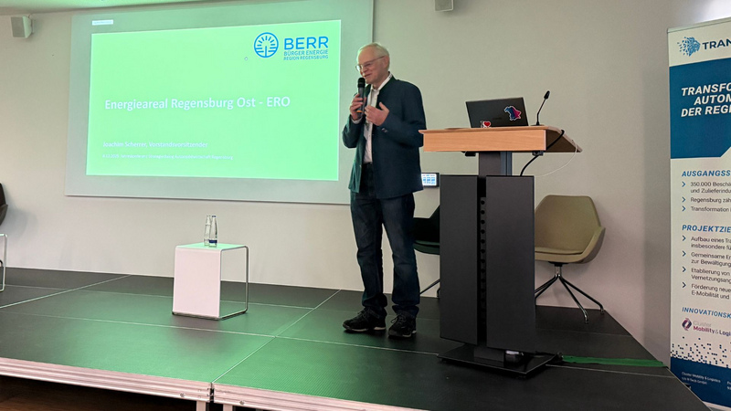 Abschließend stellte Joachim Scherrer (Bürger Energie Region Regensburg eG) das Projekt „Energieareal Regensburg Ost – ERO“ vor, das grünen Strom aus Bürgerhand für die regionale Industrie zugänglich macht. Sein Aufruf an die Region lautete klar: „Wir haben die besten Voraussetzungen in der Region – lassen Sie sie uns umsetzen.“