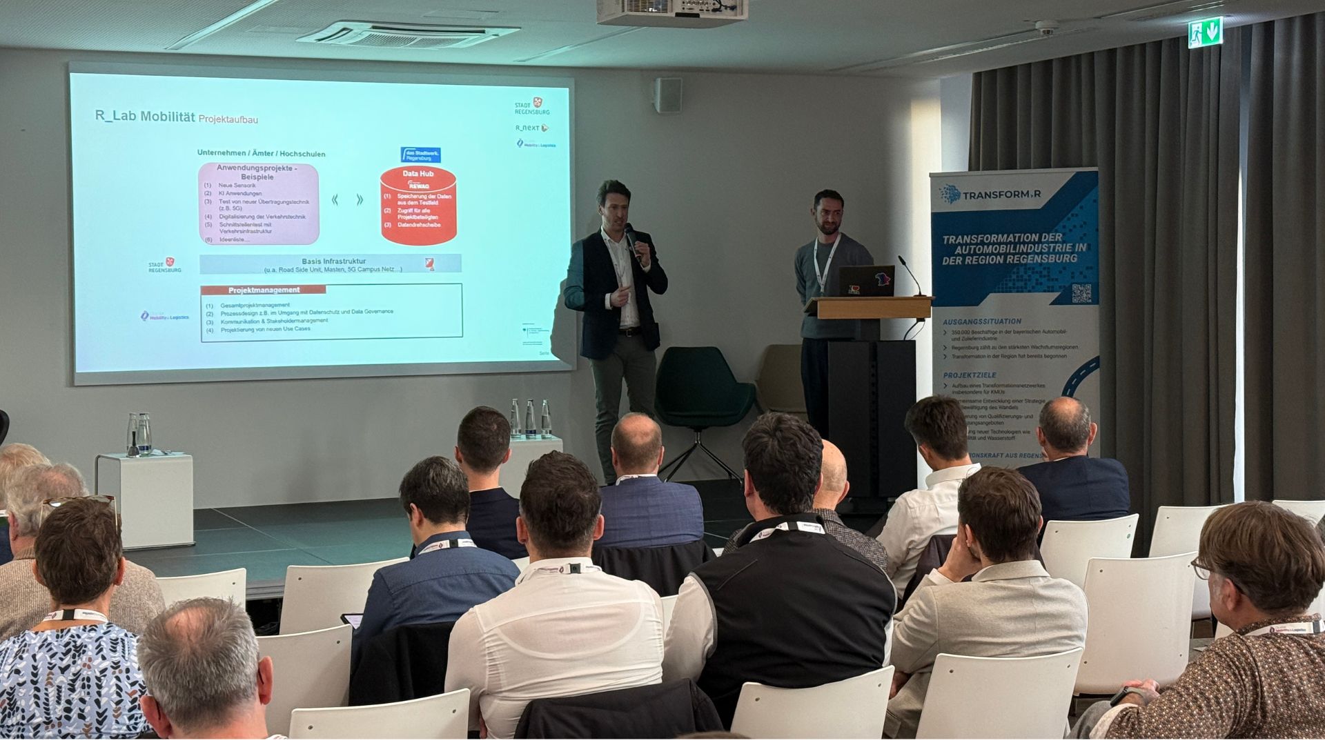 Mit dem Mobility Data Hub wurde ein weiteres zukunftsweisendes Projekt vorgestellt – präsentiert von Philipp Berr (Amt für Wirtschaft und Wissenschaft der Stadt Regensburg) und Florian Heitzer (das Stadtwerk Regensburg.Mobilität GmbH) –, das Mobilitätsdaten bündeln und vernetzt verfügbar machen soll.